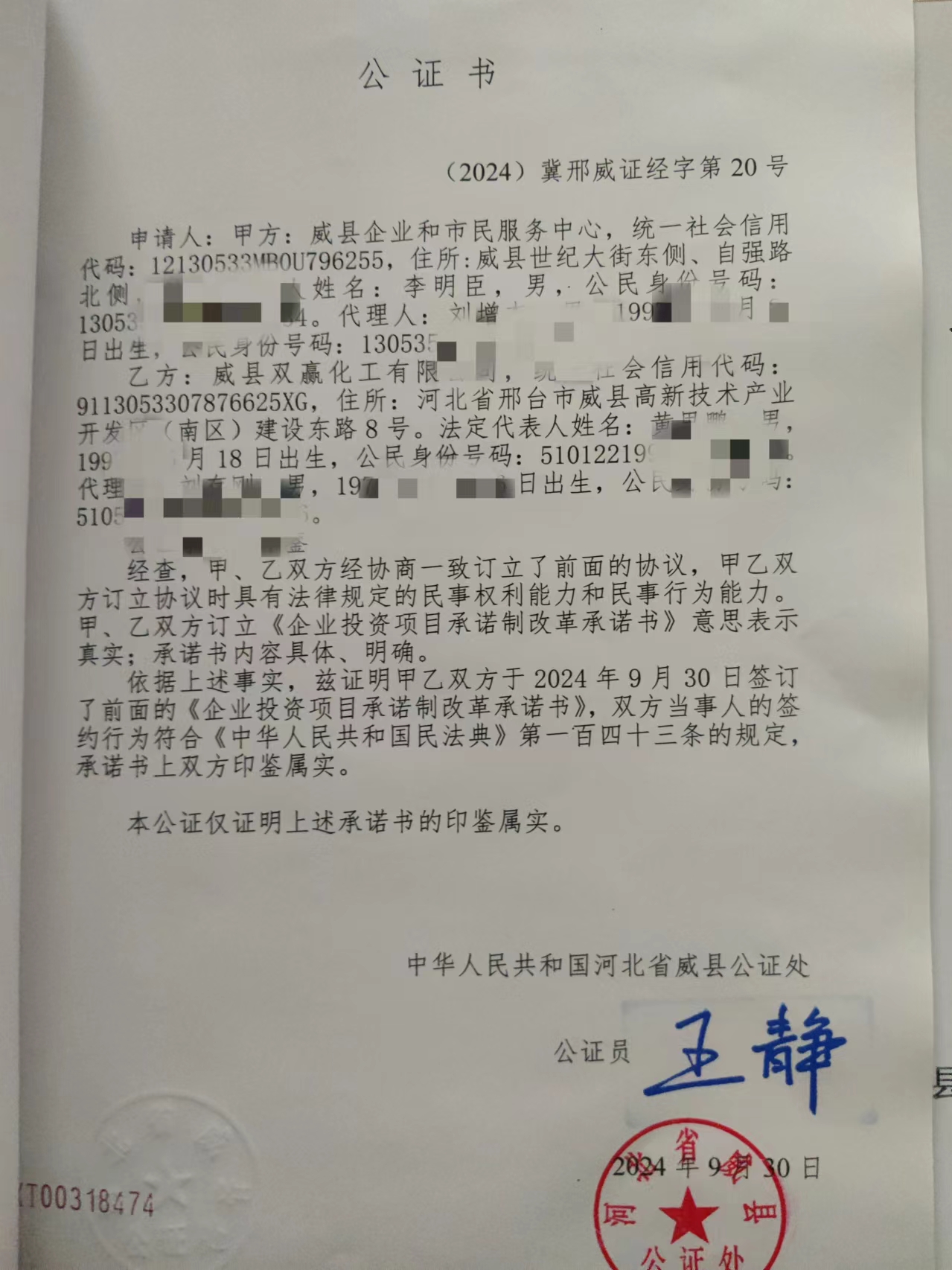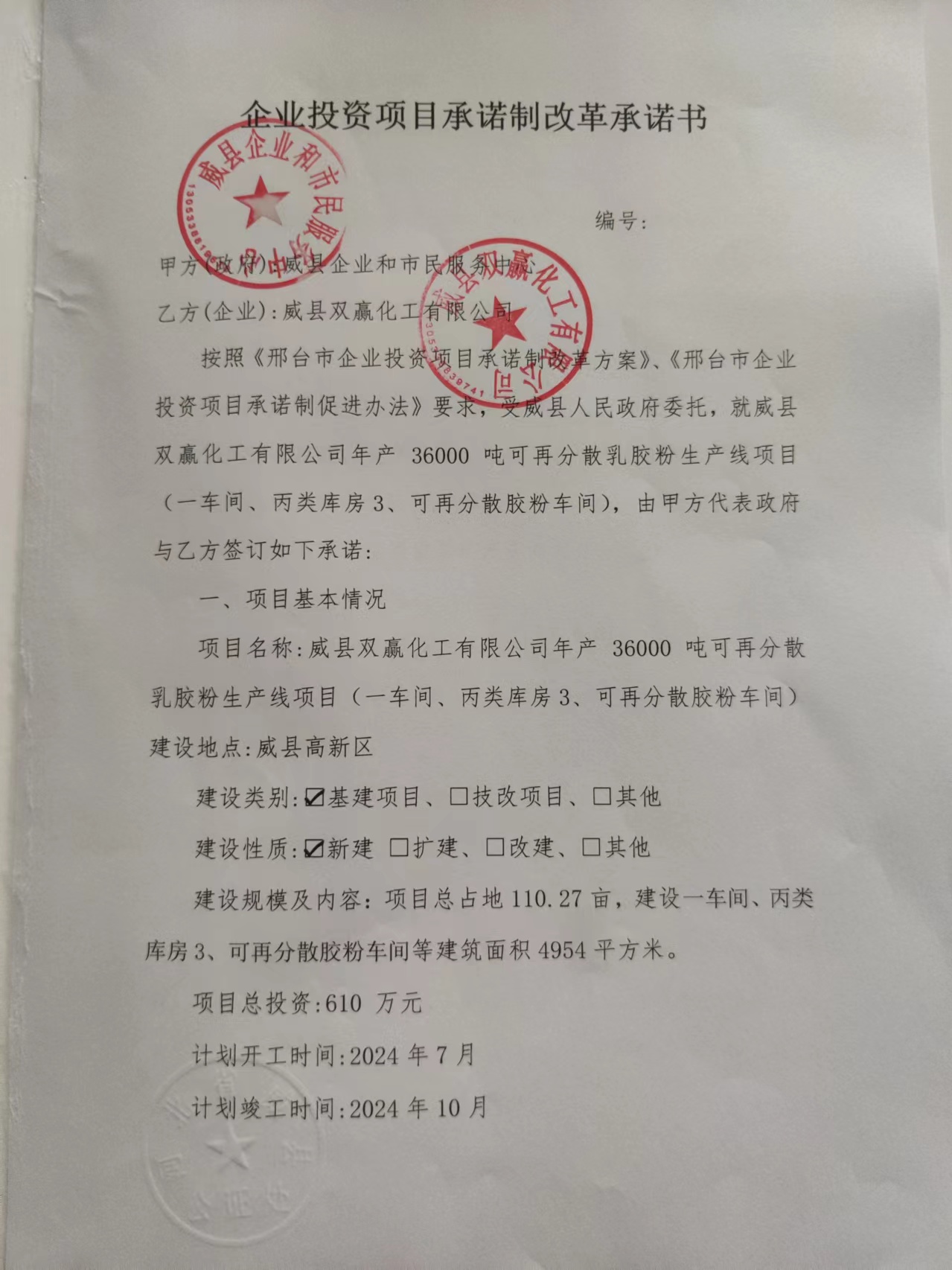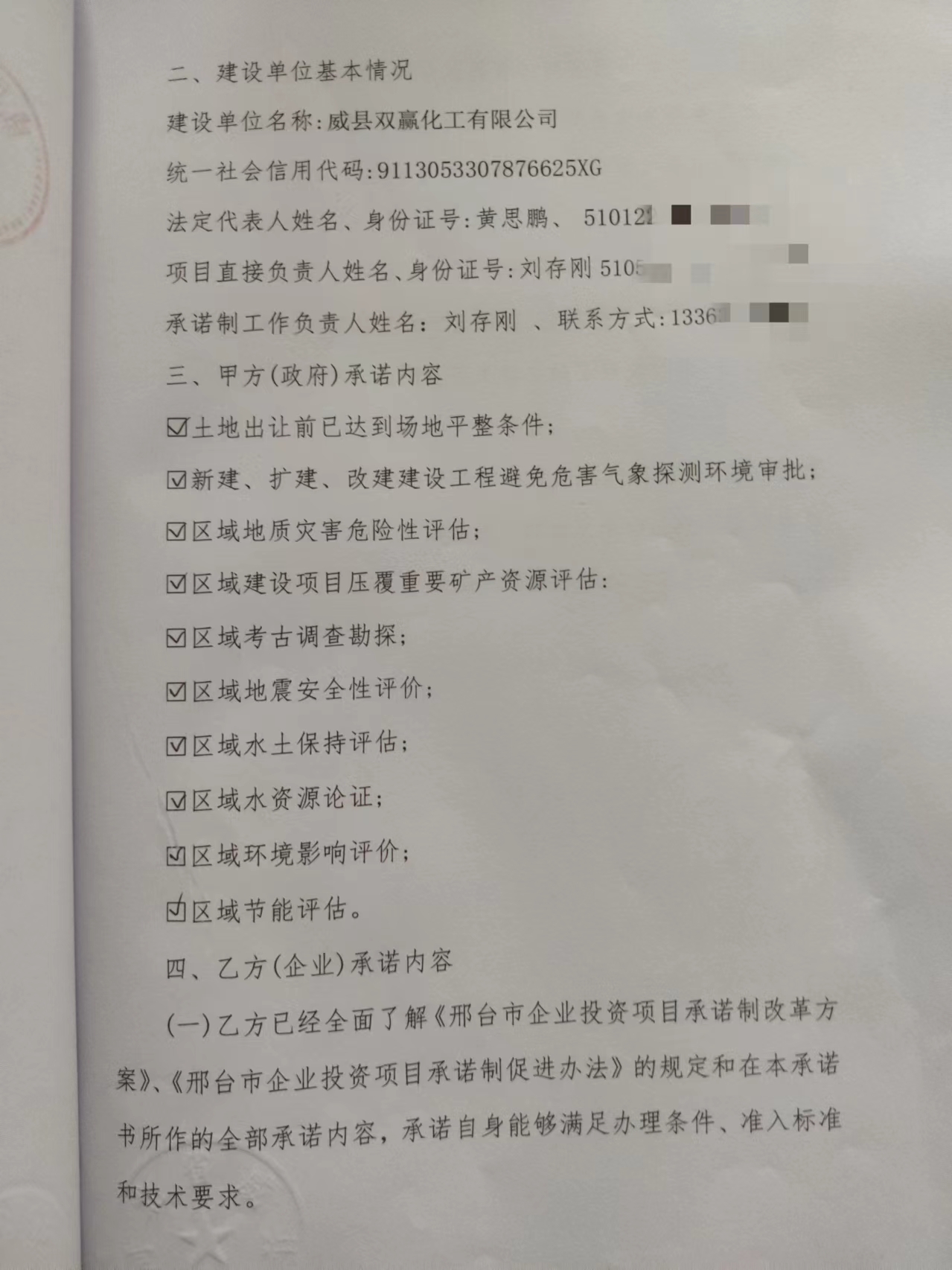 威县双赢化工有限公司企业承诺制承诺书公证