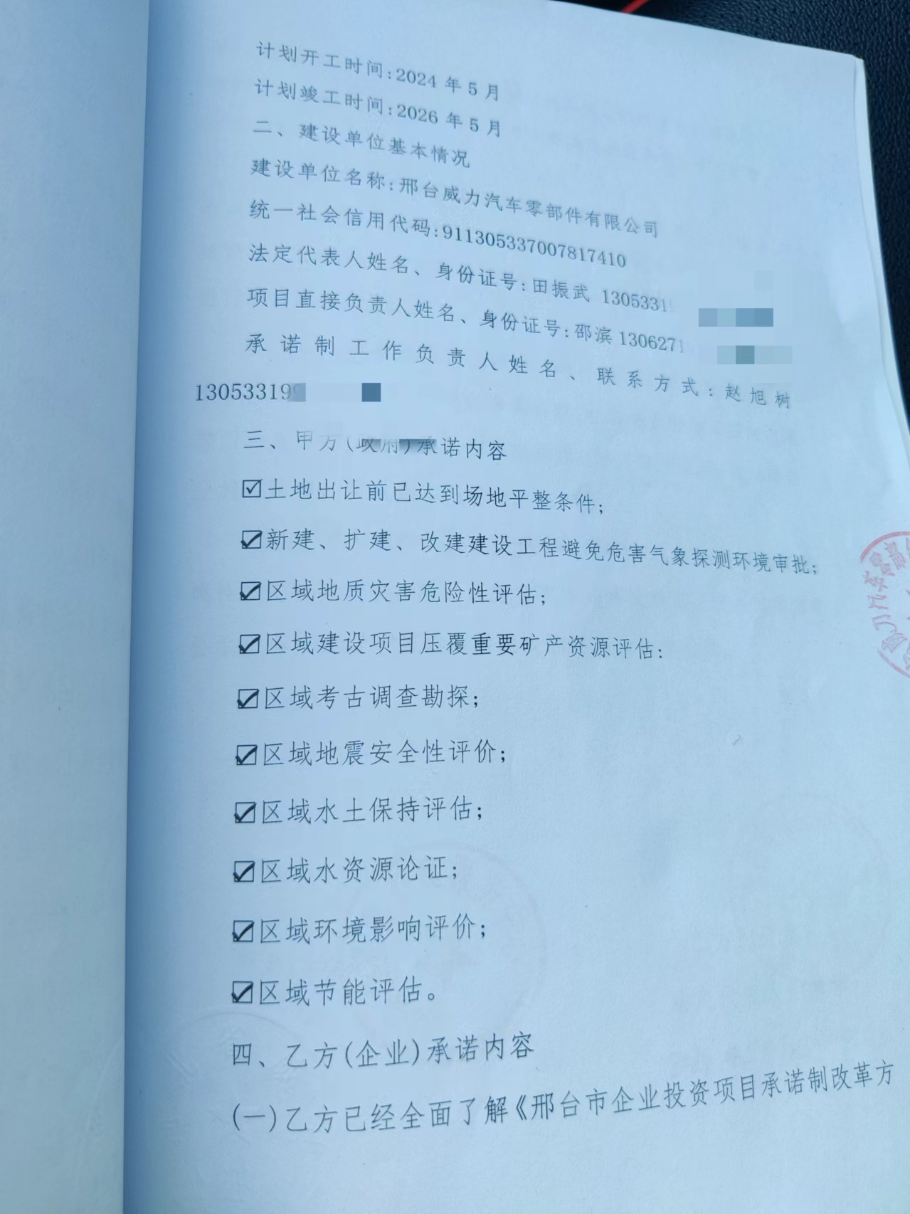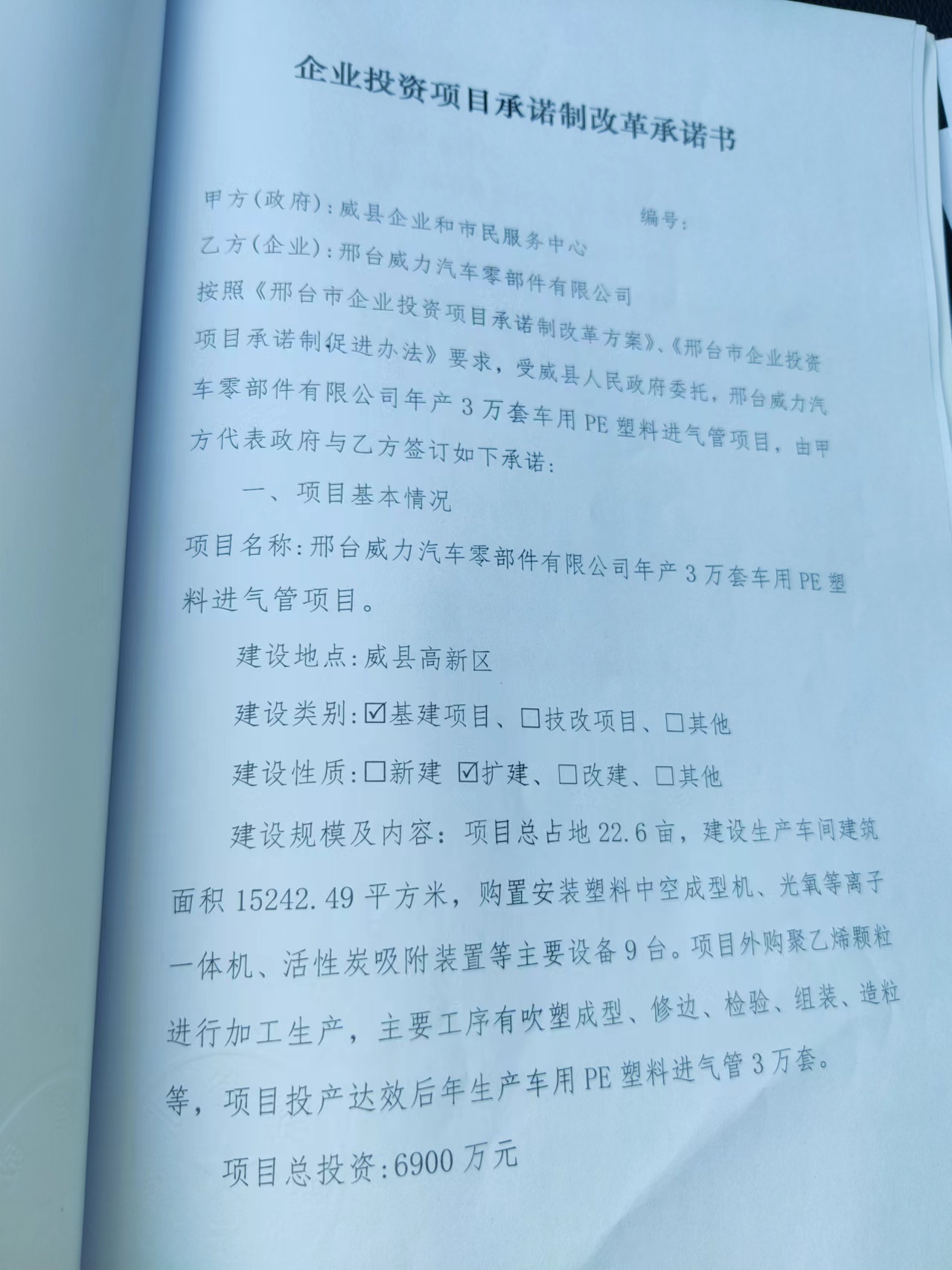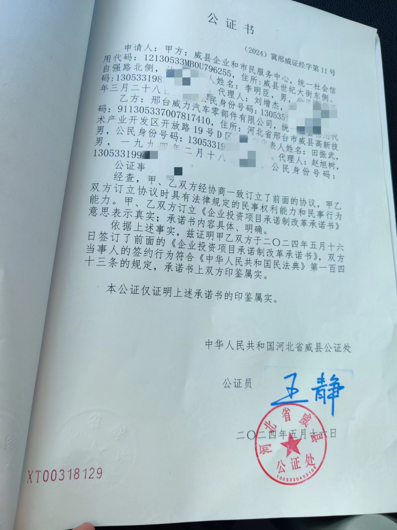 邢台威力汽车零部件有限公司企业承诺制承诺书公证